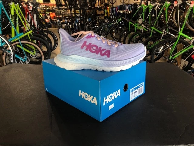 Updated model of the Hoka Mach. The Mach 5 features a low-profile cushion bed that keeps your foot closer to the ground, and utilizes a firmer material designed to provide an efficient push-off.
